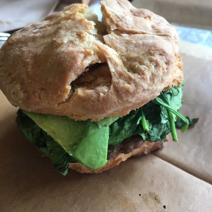 Breads On Oak is a 100% vegan artisan bakery, a little out of the way on the Riverbend side of the city. You can get a taxi or the St. Charles Avenue streetcar stop S. Carollton + Oak which is a 6 block walk. We came here for brunch, and both had a vegan buttermilk biscuit – I had the Biscuit Bravado with breakfast sausage, organic spinach and house-made béchamel. We bought an olive loaf for the apartment, and a cinnamon raisin roll.