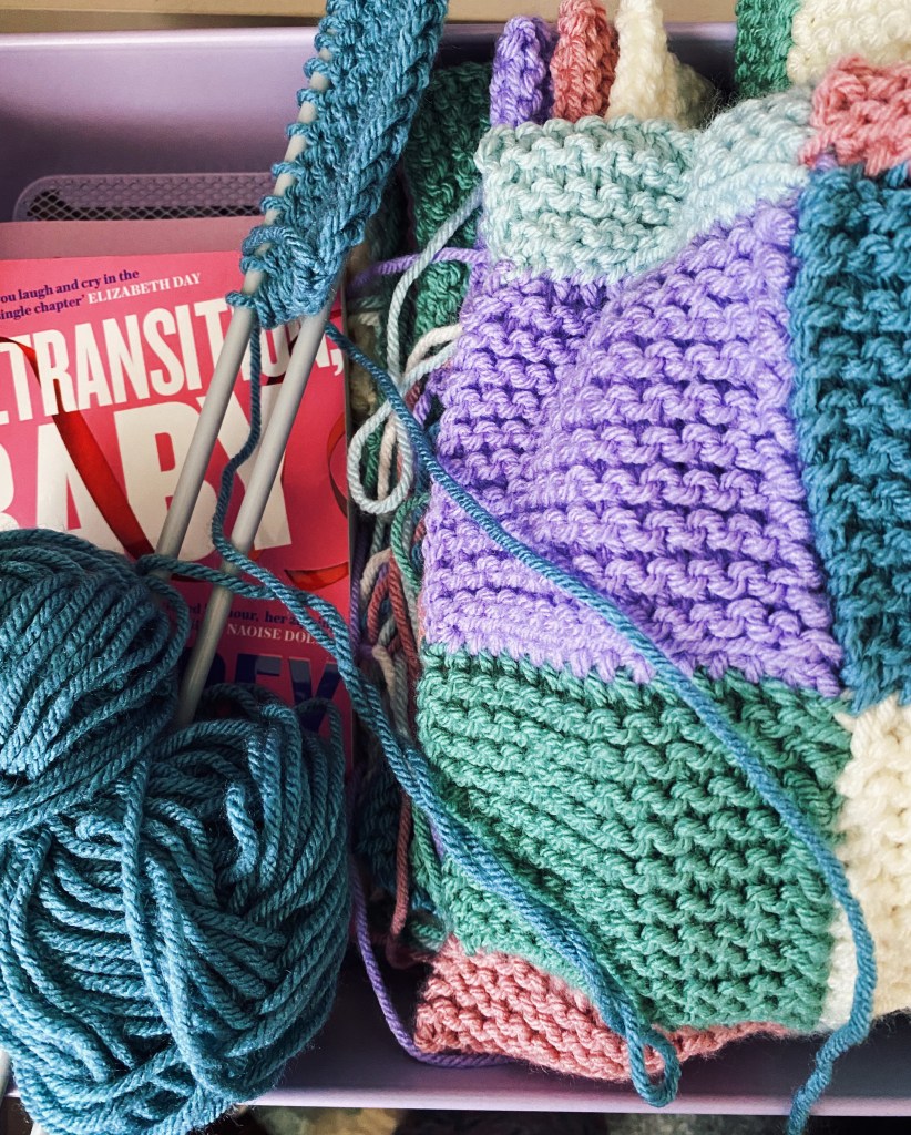 - A blanket of knitted squares that I started in March 2021. We were in a third lockdown at the time, and my sister had inspired me to knit my own blanket. I’d been aiming to finish it last autumn – it has 216 squares and by last count I had 74 left to knit. I started stitching the squares together too but haven’t picked it up since early summer. It’s getting cold now so I think I will pick it up and attempt to finish it by December!